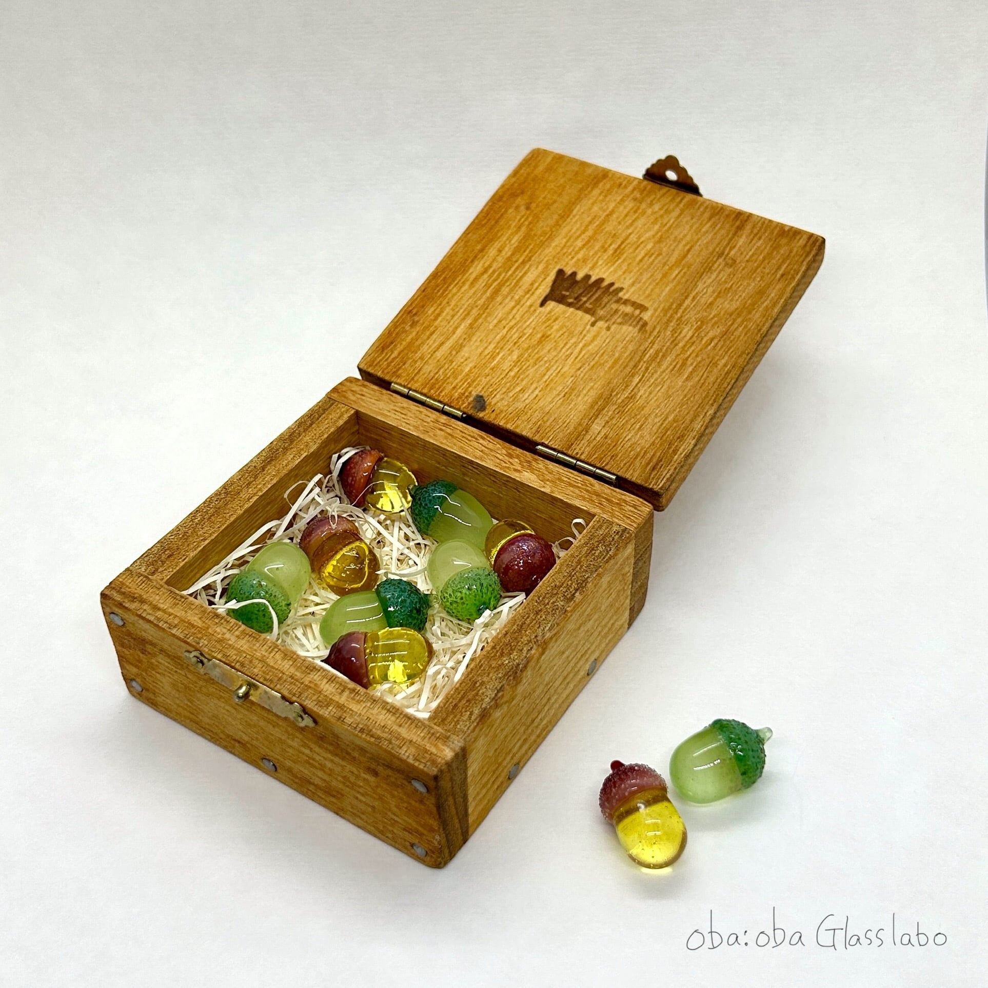 ガラスで作られたどんぐりが魅力的に並び、木製の箱に収められています。