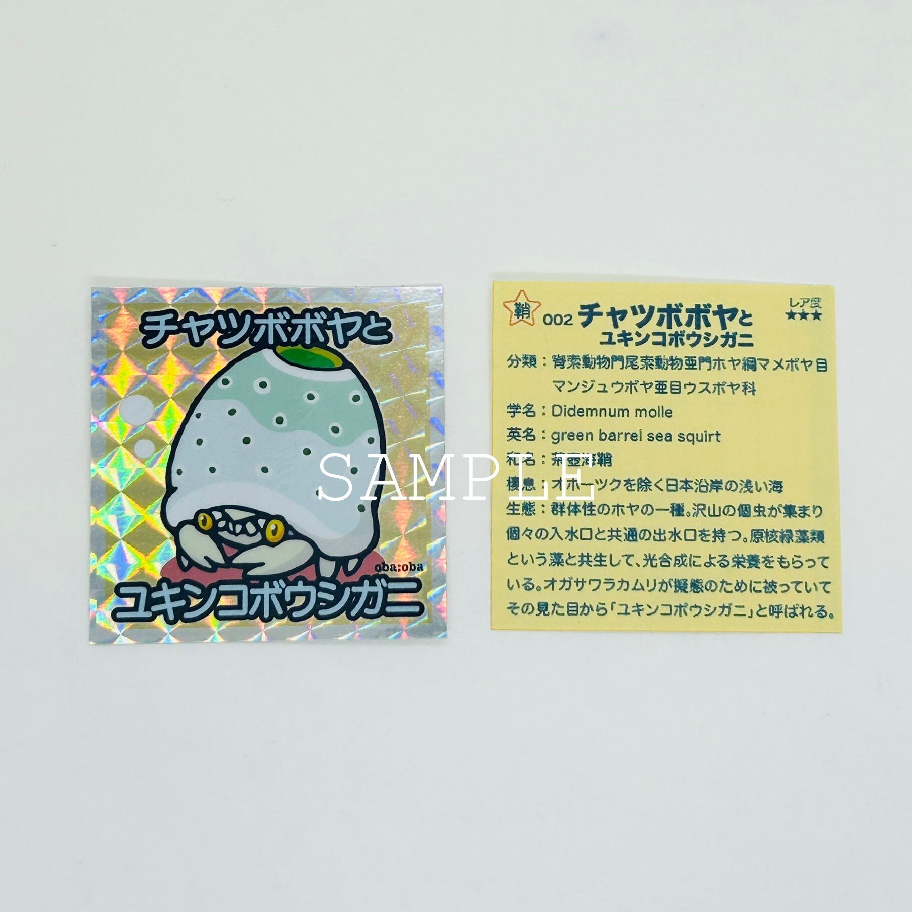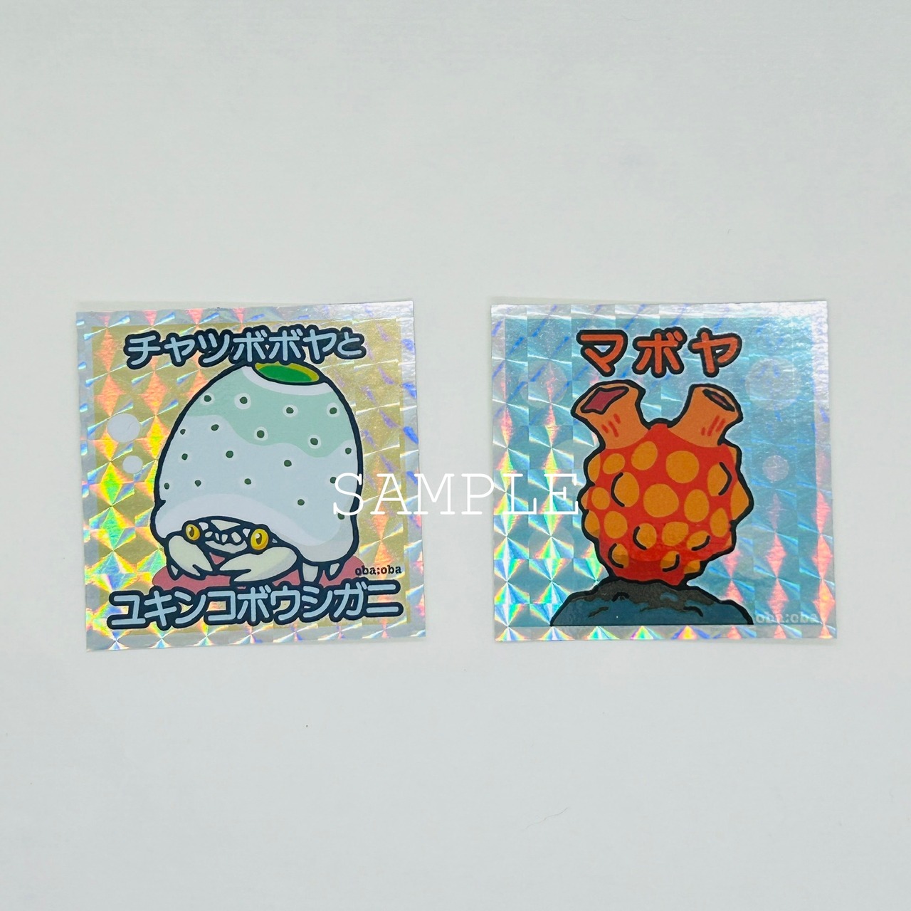 「チャツボボヤをかぶるユキンコボウシガニ」と「マボヤ」をキャラクター化したキラキラステッカー。